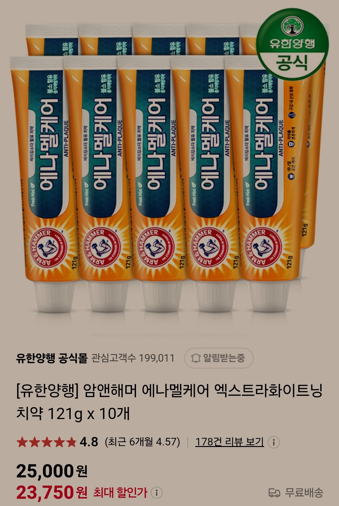 암앤해머 에나멜케어 치약 수년동안 사용중 요 근래 좋은 치약도 많이 보이지만. 여전히 에나멜케어만 고집 중 약 2.3만원 / 10개 2300 원 / 개 모든 물가가 엄청 올랐지만 이 치약은 작년이랑 가격