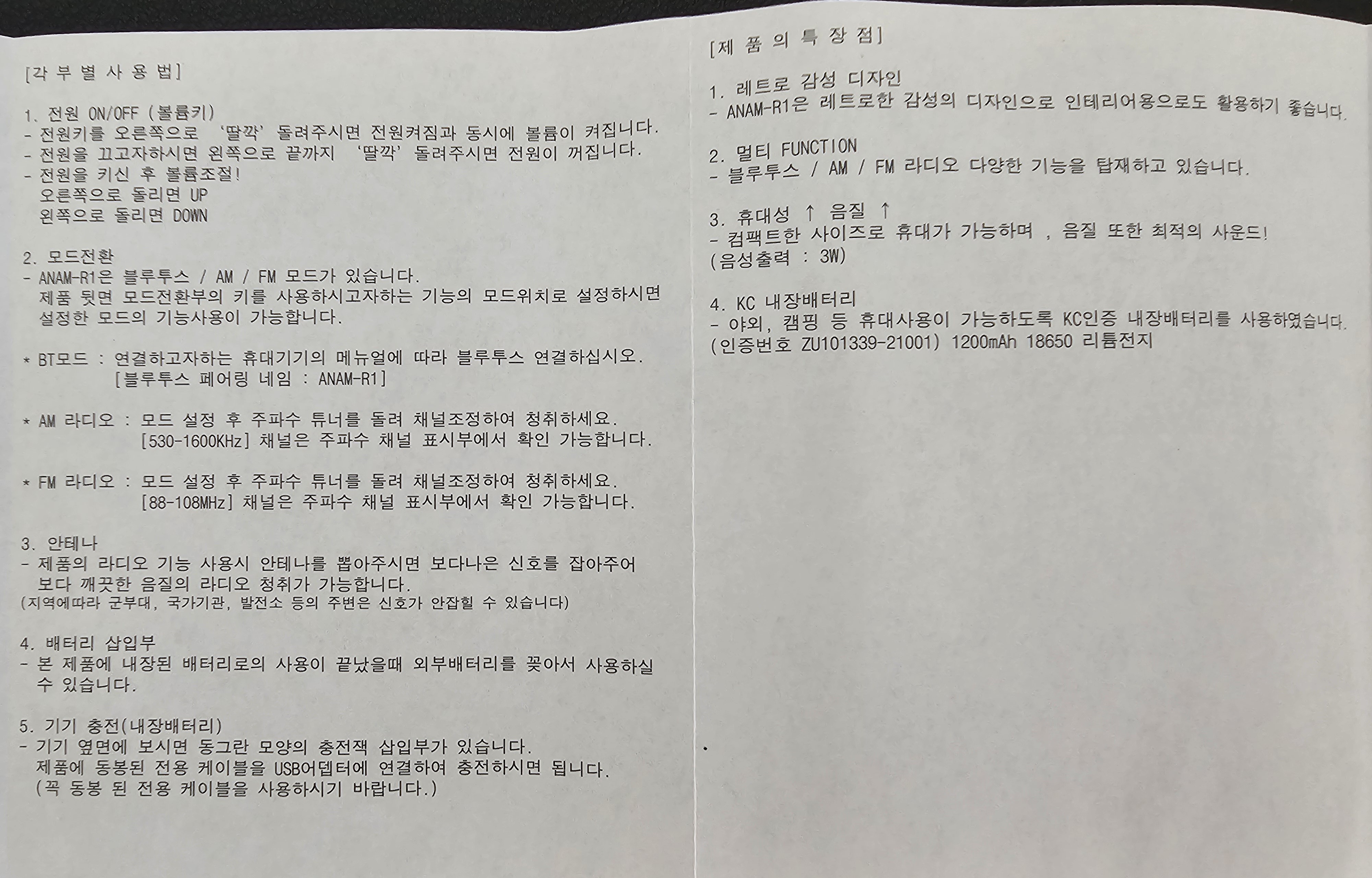모드전환 - ANAM-R1은 블루투스 / AM / FM 모드가 있습니다 제품 뒷면 모드전환부의 키를 사용하시고자하는 기능의 모드위치로 설정하시면 설정한 모드의 기능사용이 가능합니다