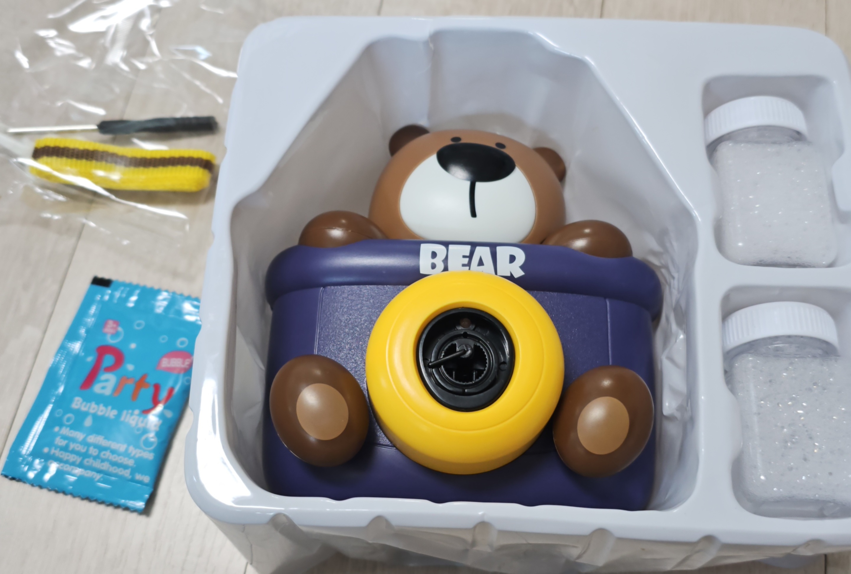 카메라와 비눗방울 용기 2개가 플라스틱 박스로