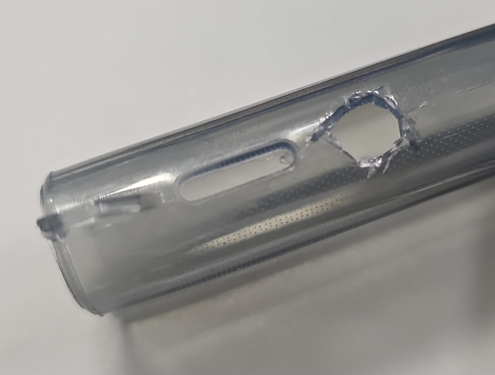 하지만 저부분을 도려냈어도 남자의 손가락이 버튼에 닿지 않았습니다. 케이스가 너무 두꺼워서요.