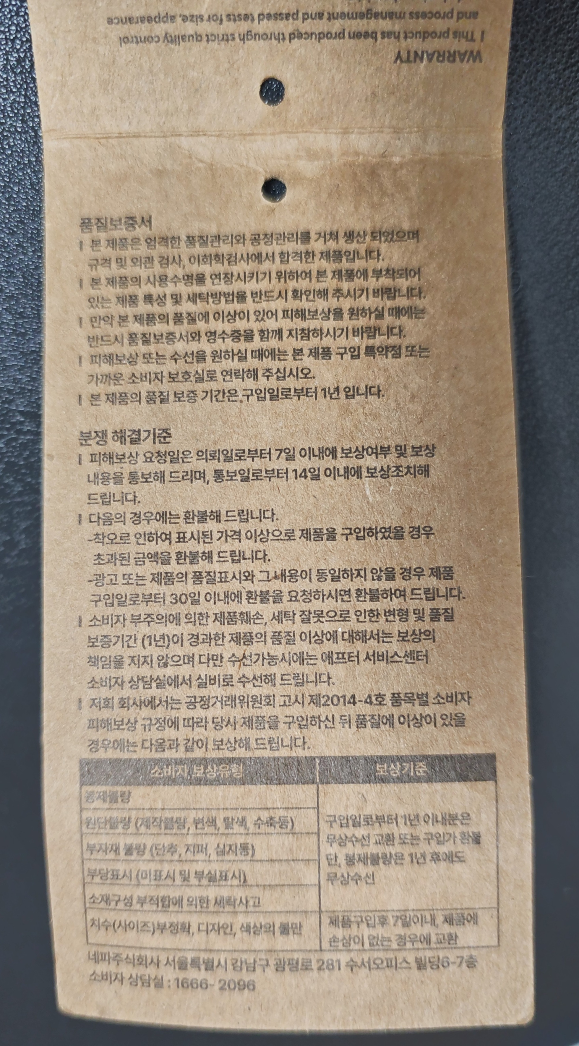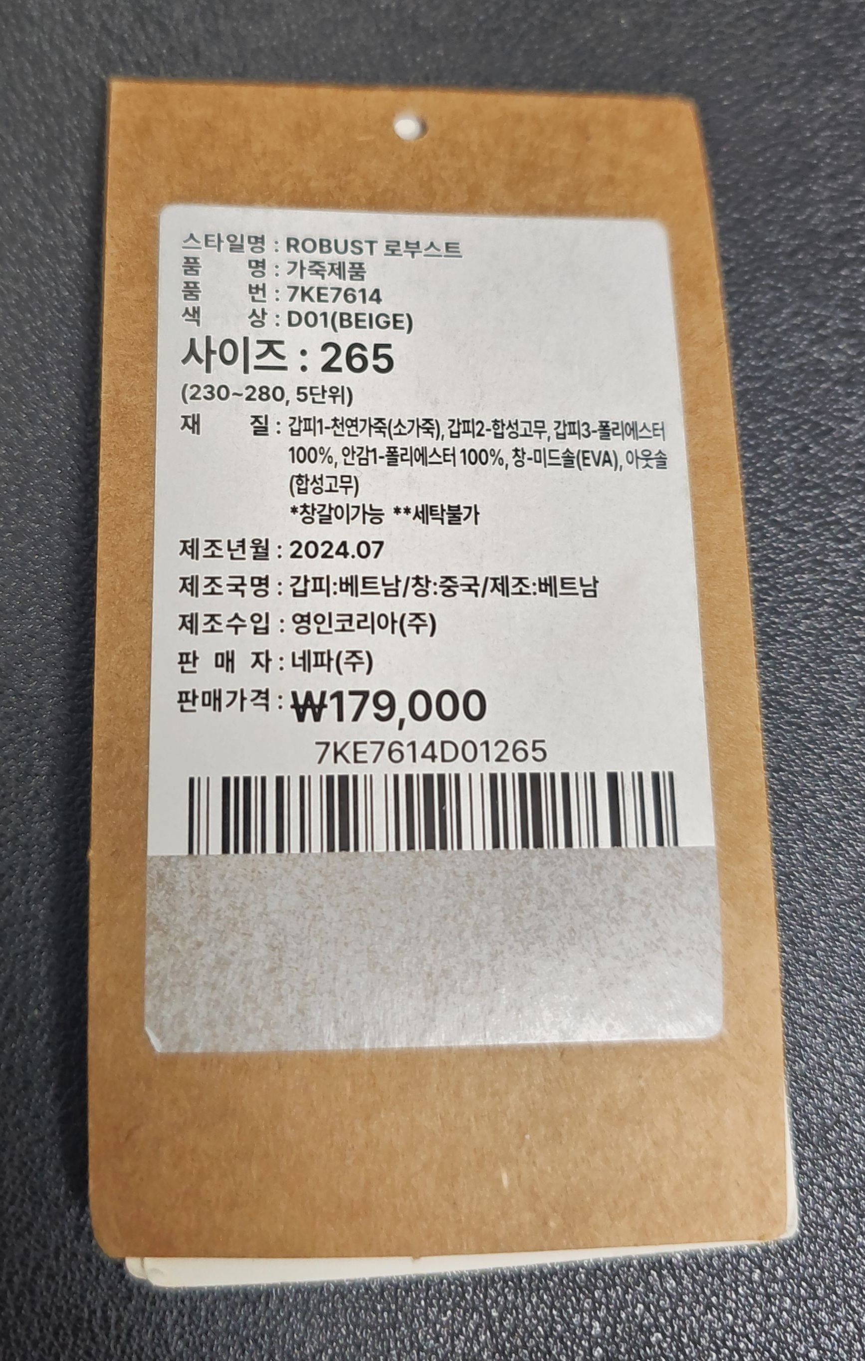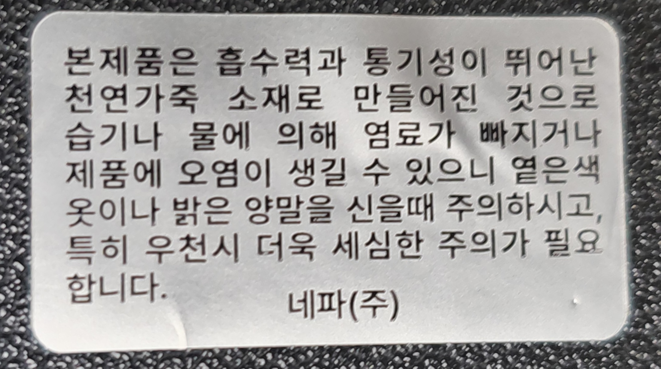 천연가죽 소재로 만들어졌다고 강조하는 라벨이 붙어 있습니다.
