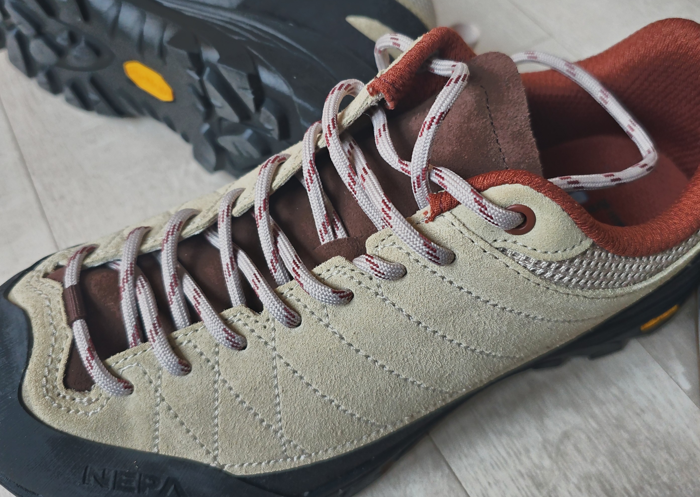 그런데, 이런 밑창을 가진 신발의 외피는 천연 가죽이네요. 관리하기 어렵다고 제조사에서도 계속 강조해서 알려주는 천연가죽 입니다.