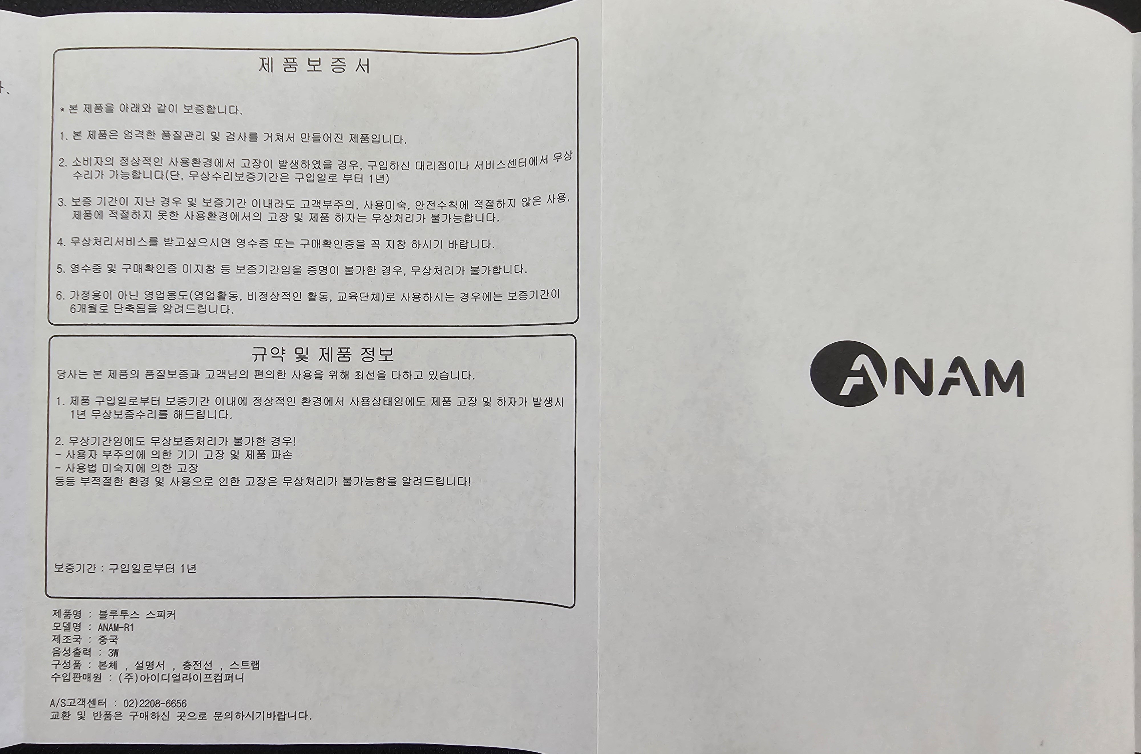 제품명 :블루투스 스피커 모델명 ANAM-R1 제조국 중국